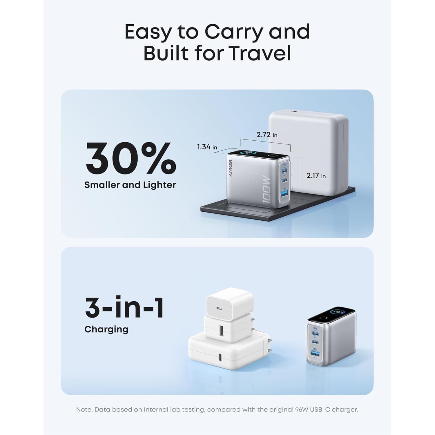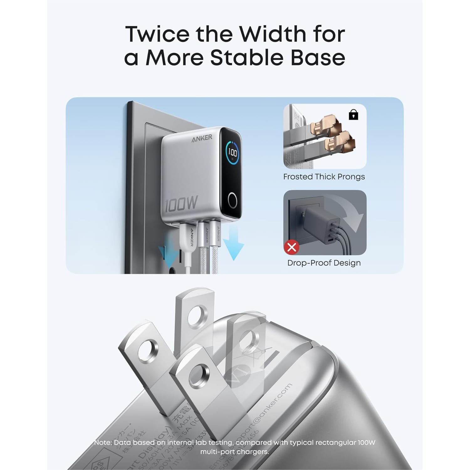 Anker 100W GaN 3 Port Charger- 100w Fast Charging Total Output- Three Ports: 2xUSB-C + USB-A- Universal Compatibility- No More Loose Wall Connection – Special prongs for secure fit- Real-Time Display- Includes Fast Charging braided USB-C Cable- UL CERTIFIED100W Fast GaN ChargerExperience unparalleled speed with this 100W charger, featuring GaN technology. It also includes comprehensive safety features like short-circuit and over-temperature protection. Elegant. Compact. Powerful.Enjoy fast, efficient charging with this beautifully designed charger that weighs just 7.47 oz.Built to Stay PutSecure your charger with the unique stacked design and strategically covered pins, which prevent slipping and ensure a stable connection. The foldable plug and generous spacing between ports further enhance its usability and stability.High-Definition ScreenStay informed with an intuitive touchscreen display that offers instant updates on power, port status, and temperature. Complies with UL. 2.72″ L x 2.17″ H x 1.34″ W