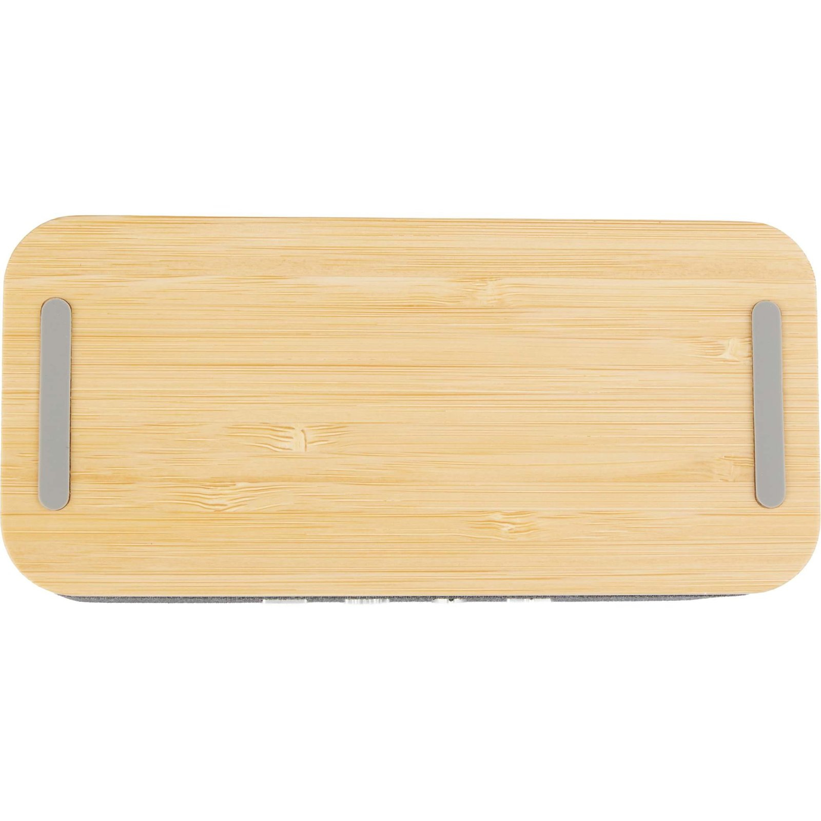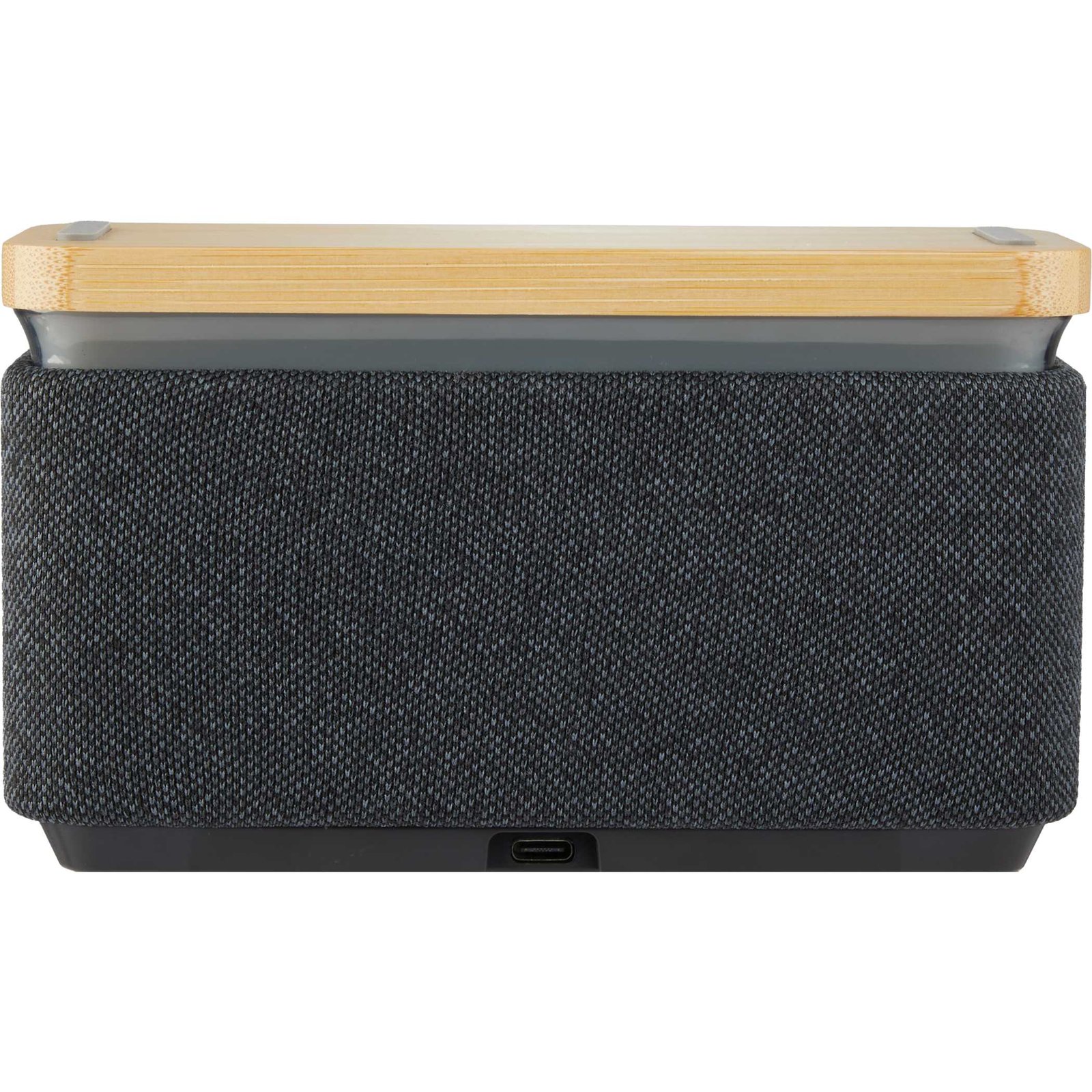 The Boost Fabric & FSC® Certified Bamboo Speaker with Wireless Charging Pad is perfect for the desk or countertop. The on-trend mixed-material appearance of the bamboo and RPET fabric wrap, combined with multi-color lights, will get anyone’s attention. The speaker’s 5-Watt output produces crystal-clear sound. Plus, the top of the speaker is a 10-Watt wireless charging pad that charges any compatible device. For wireless charging, this speaker must be plugged in. The built-in 3000 mAh battery wil. 2.80″ D x 6.10″ W x 3.50″ H