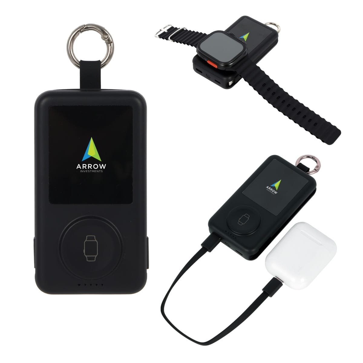 The Charter 6200mAh Light Up Power Bank with Watch Charger & Keyring delivers convenient backup power in a compact, portable design. It features a built-in wireless charging pad for Apple Watch and select Samsung watches, plus USB-C and Lightning input/output ports. Complete with a detachable USB-C to Lightning cable, light-up logo area, and attached keyring, it is ideal for travel, commuting, and everyday use. A QR code is printed on each item providing access to the latest user manual. Complies with FCC, Prop 65, UN38.3. 2″ L x 0.875″ W x 2.75″ H