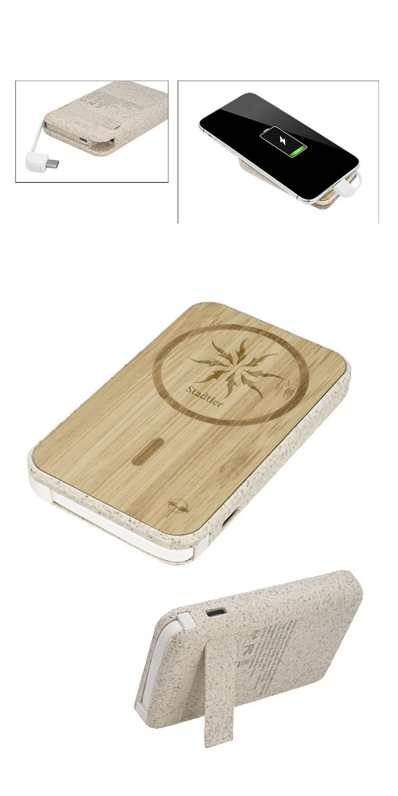 Charges through most protective cases Not compatible with cases featuring magnetic components, metal or finger ring Constructed using a blend of materials including sustainable Wheat Straw Mix, a Bamboo top exterior, and Silicone Power bank capacity: 5000 mAh NOTE: If your device is not compatible with wireless charging you may require external wireless charging receiver or receiver case Type-C Input: 5V/2.4A Approx 3 hours recharge time Type-C Output: 5V/2A LED lights indicate battery levels. 0.625″ D x 2.5″ W x 4.125″ H