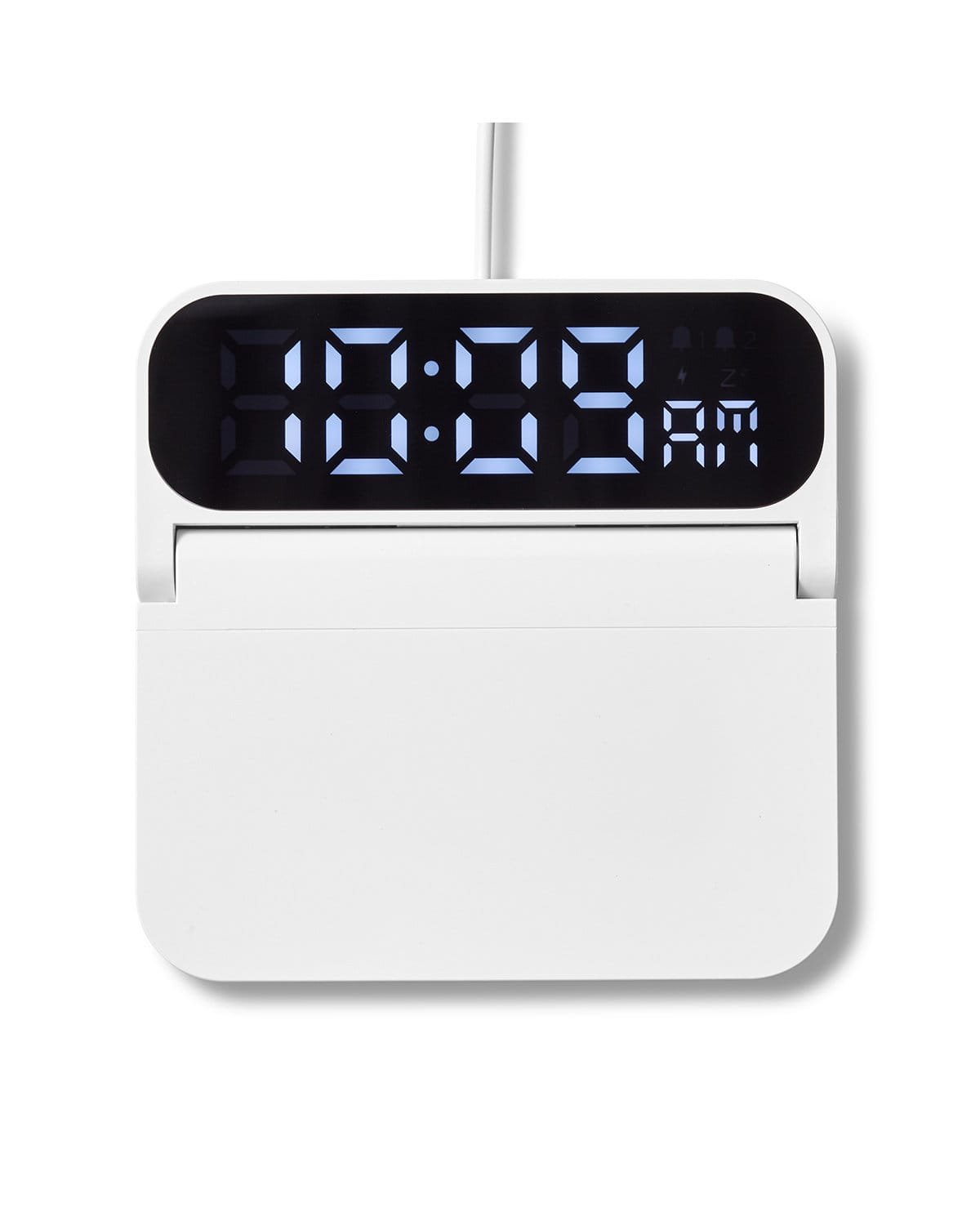 ABS Plastic digital alarm clock with wireless charger function (Fast Charge enabled). Retro design style features large digital clock display with 3 adjustable brightness levels and 2 alarm settings. Compatible with most phones that support wireless charging. It is recommended to check your device specifications before purchasing to ensure compatibility. Supports fast charging up to 15W when paired with any 20W+ or PD wall adapter. Power/Technology: Wireless Output: 5W/7.5W/10W/15W. NOTE: In order to achieve fast charge, this device must be powered by a PD20W (or above) or QC2.0 adapter. Novel imprint area for full color designs. Note: Most cases must be removed from phone for wireless charging to work. Uses 1 button cell battery (type CR1220), included and replaceable, for memory function. Includes instructions and USB A to USB C charging cable. Item size listed for item when flat, in use item measures: 5.5″W x 2.5″H x 3.5″D. 5.5000″ W x 5.5000″ H x 0.6250″ D