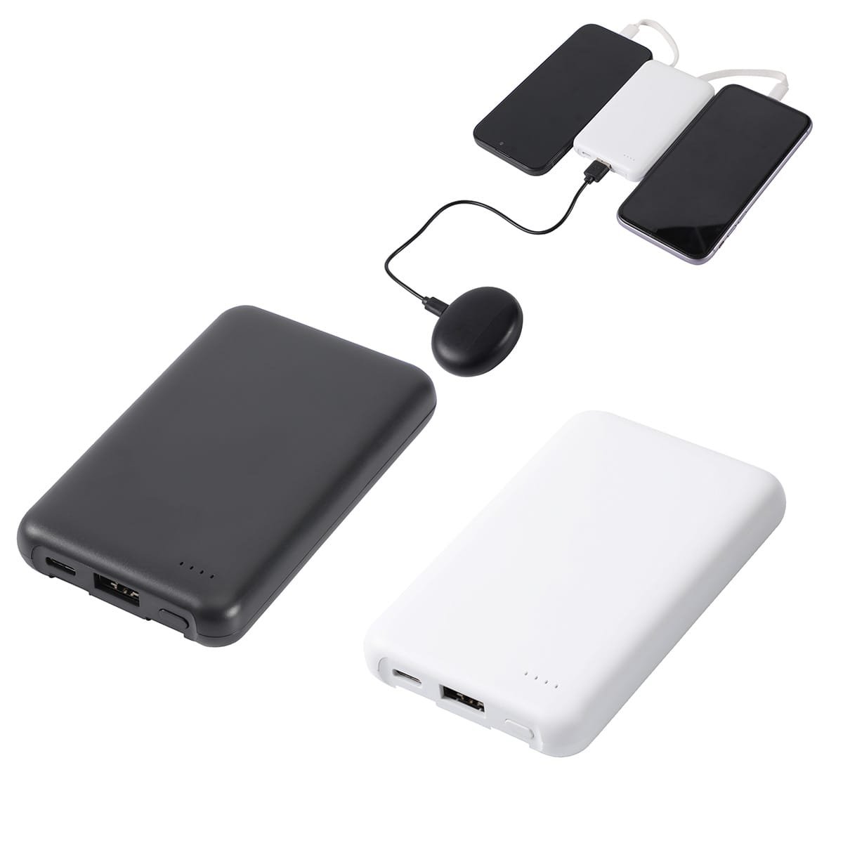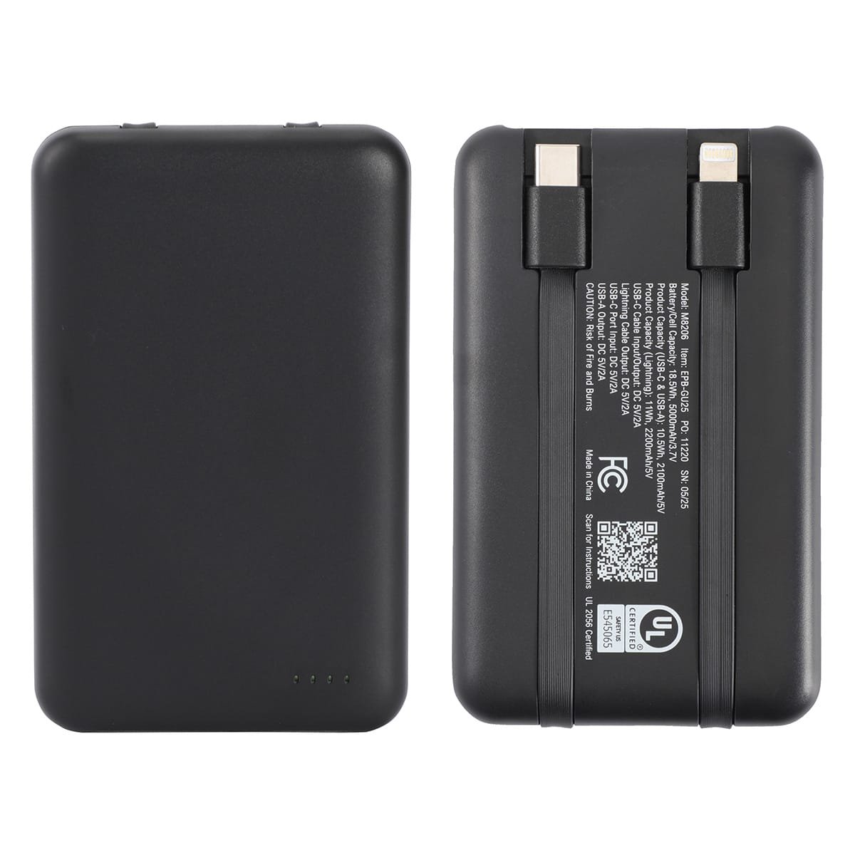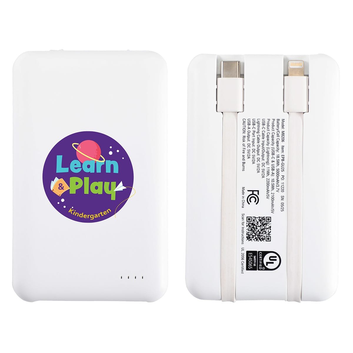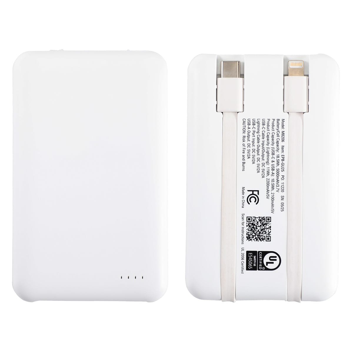 Stay powered up anywhere with the Guild 5000mAh UL-Listed Power Bank! Designed with built-in USB-C and Lightning cables, it delivers fast charging without the hassle of extra cords. A QR code is printed on each item, providing access to the latest user manual. Featuring dual input/output ports for ultimate versatility, this slim and lightweight power bank keeps phones, tablets, and accessories ready for action—perfect for travel, work, or everyday use. Complies with OU, Prop 65, UN38.3. 4″ L x 0.625″ W x 2.5″ H