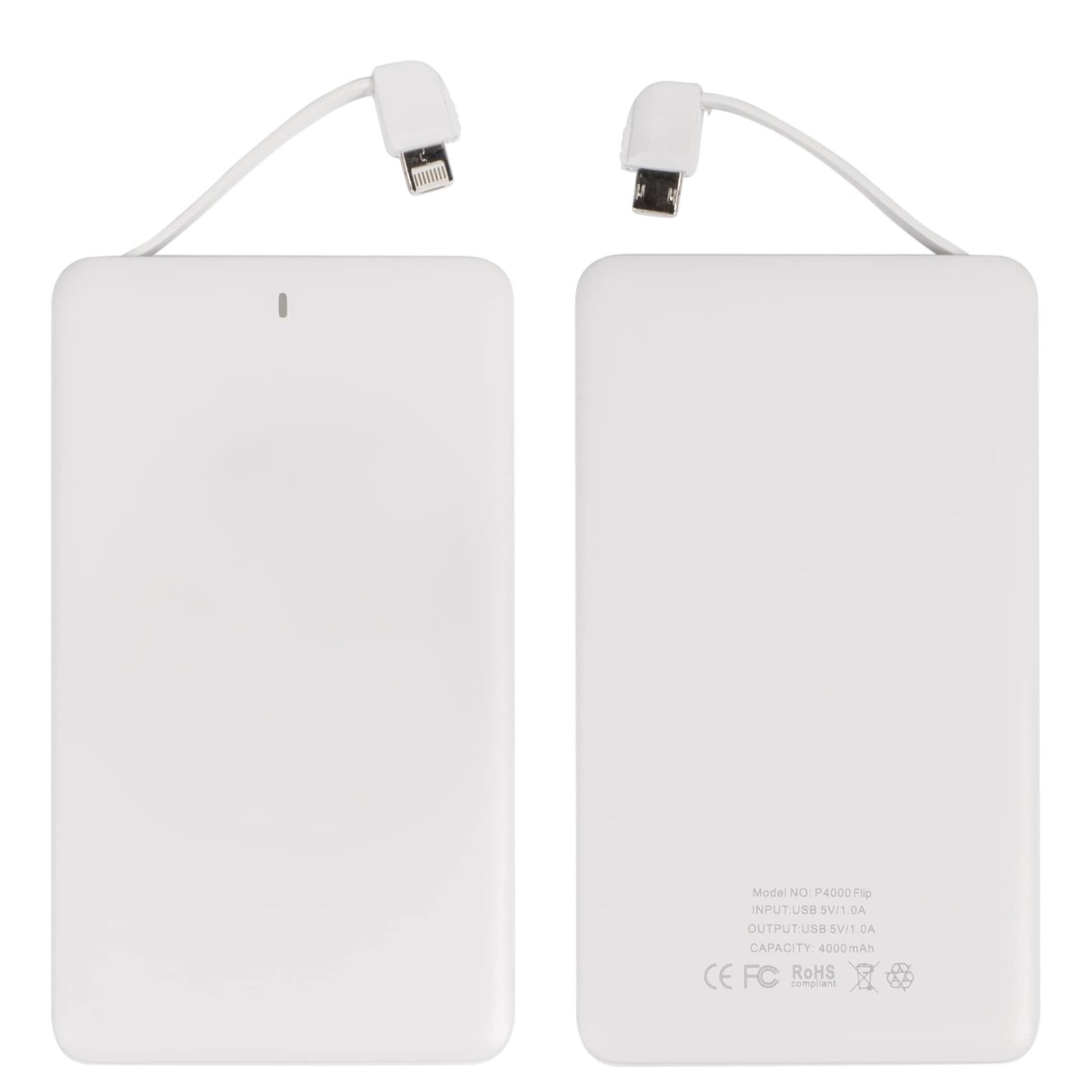The iTwist 4,000mAh 4-in-1 Power Bank saves you from FOBO, fear of a battery outage, when you need your cell phone most.Simplify your life with built-in dual Lightning and Micro USB connectors (1 on each side). This compact, portable power source provides 1 full charge for most smartphones. Compact and light enough to stow in a bag or backpack without weighing you down. Get the iTwist 4,000 mAh 4-in-1 and leave FOBO behind. Complies with CE, FCC, Prop 65, RoHS. 4.5″ L x 2.6″ W x 0.35″ H