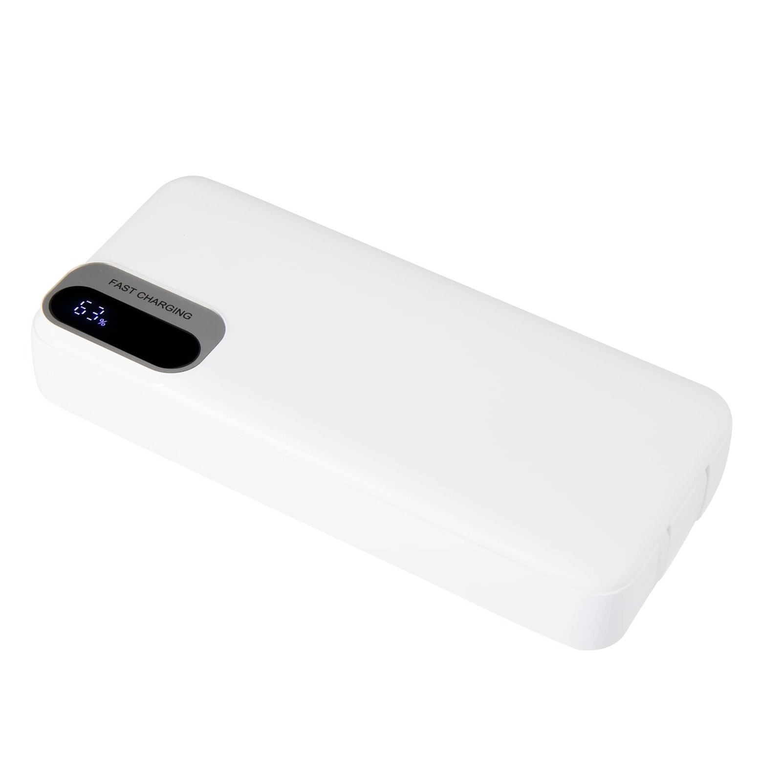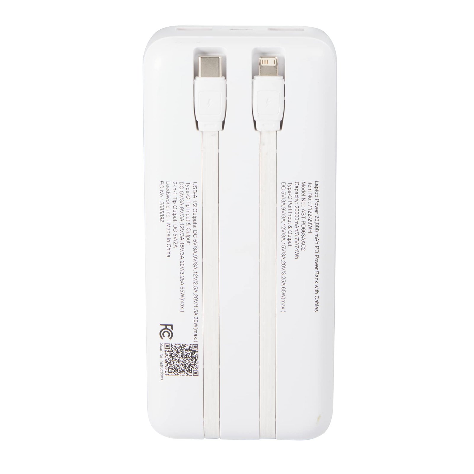 The Laptop Power 20,000 mAh PD Power Bank with Cables is a high-capacity charging solution designed to keep your devices powered wherever you go. Featuring a rechargeable lithium polymer battery (74Wh), this power bank is capable of charging smartphones, tablets, and even laptops powered by Type-C. A built-in digital display provides real-time power capacity updates, ensuring you always know your available charge. The integrated cables include a Type-C tip for newer Android phones, iPhone 15/16 series, and Type-C-powered laptops at a maximum of 65W charging speed, while the second cable features a 2-in-1 tip compatible with iPhone 14 series and below at 10W max charging speed. Additionally, it includes a Type-C port and two USB-A output ports, offering versatile charging options. Packaged in an FSC-certified premium gift box. Power banks are permitted in carry-on luggage only, and at the discretion of TSA agents. Please charge before initial use. 5.79″ D x 2.64″ W x 1.14″ H