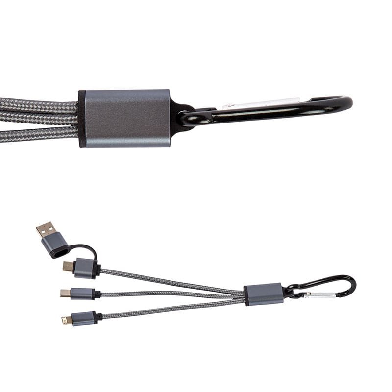 Introducing the Libra 4-in-1 Charging Cable Set your ultimate solution for versatile and efficient charging on the go. This compact tech accessory features a dual USB-A and Type C head, along with a dual 5-pin Lightning / micro USB cable and an additional Type C cable, ensuring compatibility with a wide range of devices. Each cable is crafted with durable braided coverings that enhance flexibility and resist tangling, providing both style and longevity. The aluminum connectors boast a sleek me. Complies with Prop 65. 1 1/4″ W x 7 1/4″ H x 5/8″ D