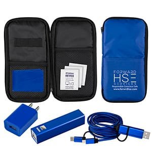 Case includes the following unimprinted items that all match the case color: #5088 6″ x 6″ Microfiber Cleaning Cloth, #PB102 UL Listed 2200 mAh Power Bank with Micro USB charging cable, #5127 UL Listed USB Wall Charger and #5141 5-in-1 Charging 6 Ft. Charging Cable. Powerbank not recommended for use with tablets. Do not talk on phone while plugged into wall charger. Material: Case Material: 420D Polyester Outside. Complies with Prop 65, UL. 4 1/2″ W x 8 1/2″ H