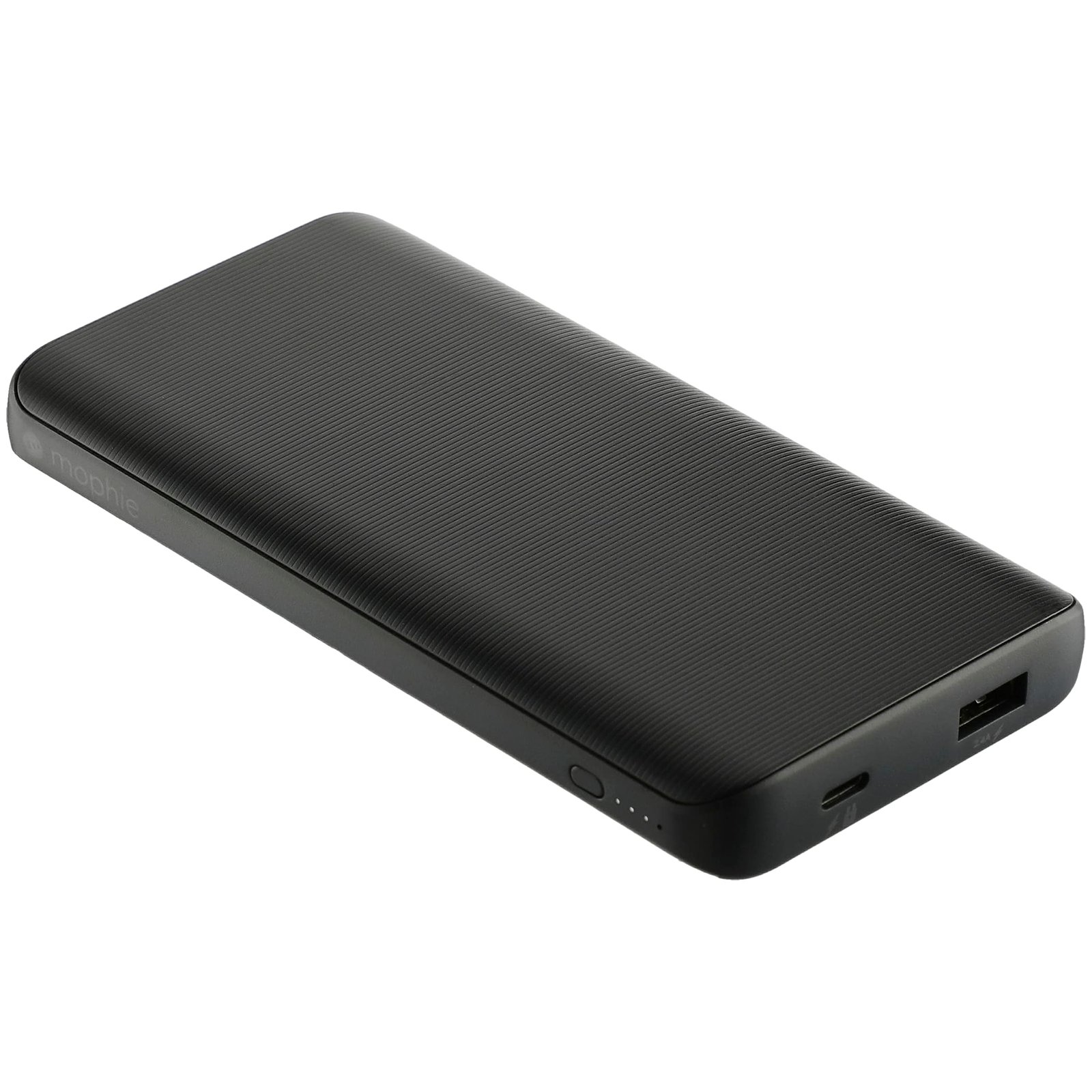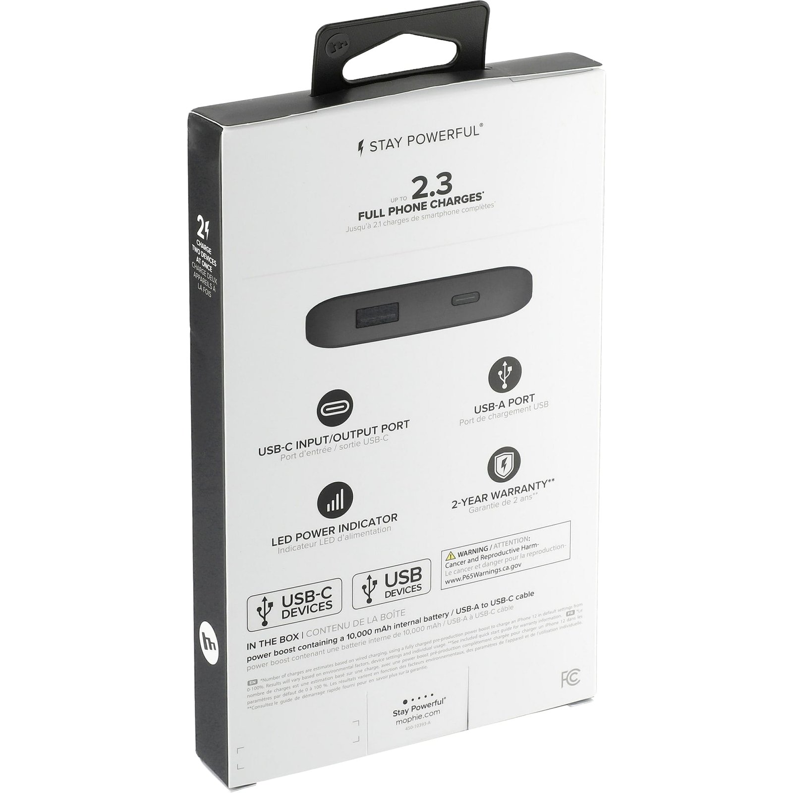 The mophie® Power Boost 10,000 mAh Power Bank has a rechargeable lithium polymer battery (37Wh) that can charge two electronic devices at the same time with one Type-C and one USB-A output ports. Included USB-A-to-Type-C cable. Packaged in a premium gift box. Power banks are permitted in carry-on luggage only, and at the discretion of TSA agents. Please charge power bank before initial use. 0.25″ D x 2.75″ W x 5.50″ H