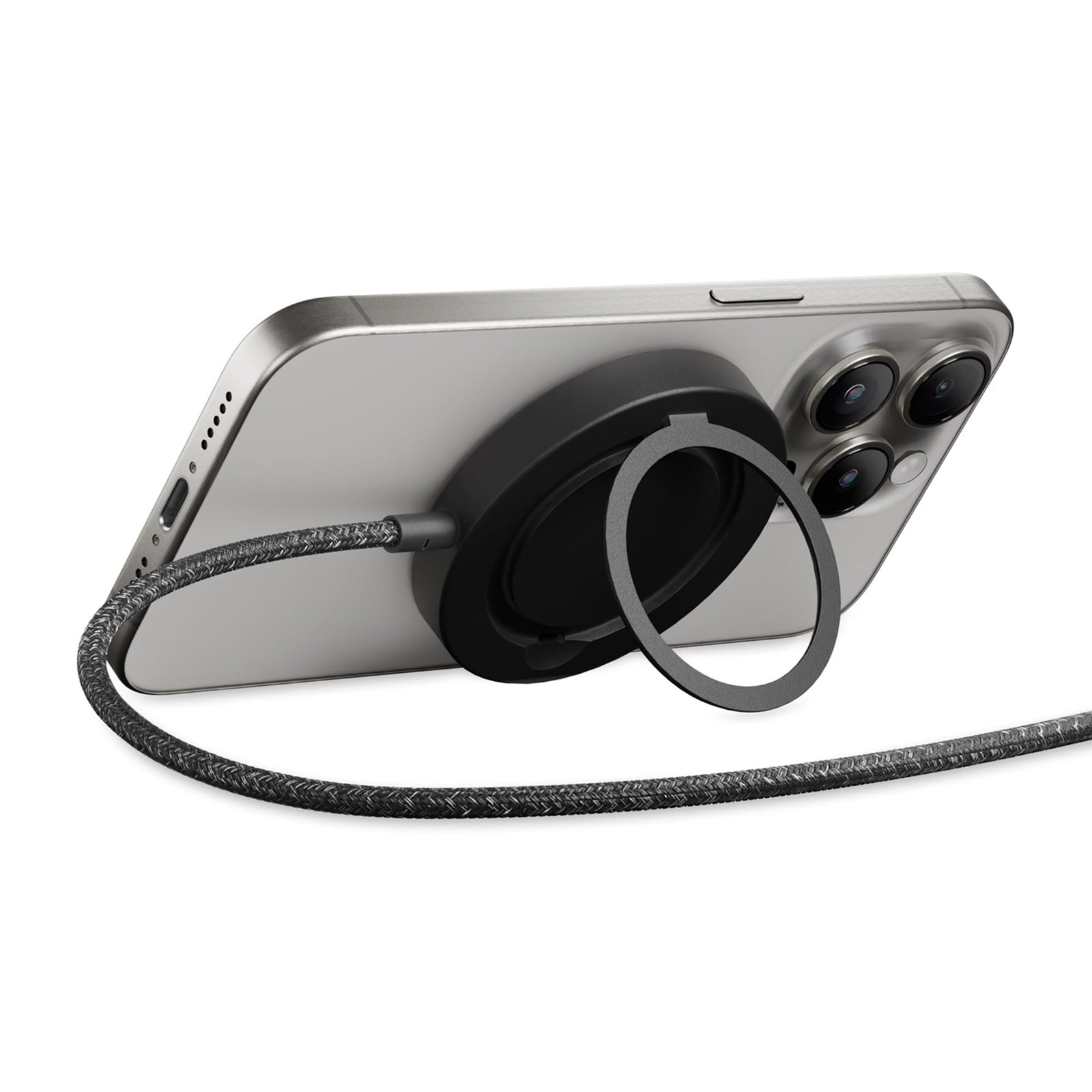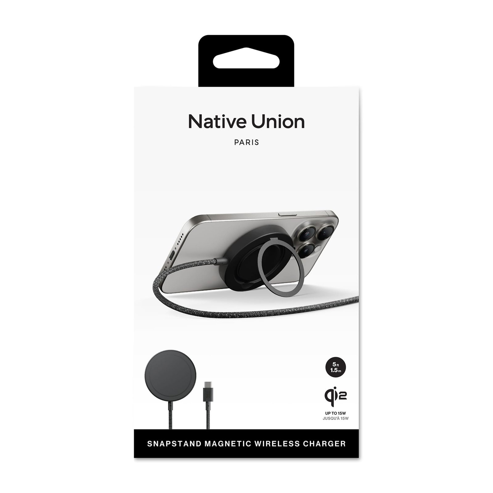 The Native Union Snapstand Qi2 Wireless Charger magnetically aligns your iPhone for up to 15W fast, safe charging. Its built-in kickstand is perfect for StandBy, streaming, or calls, while the 5′ reinforced braided cable offers flexible placement. Qi2 certified, MagSafe compatible, and works with iPhone 12-16, select Qi devices, and AirPods. Complies with CPSIA, Prop 65. 0.79″ W x 2.36″ H x 2.36″ L
