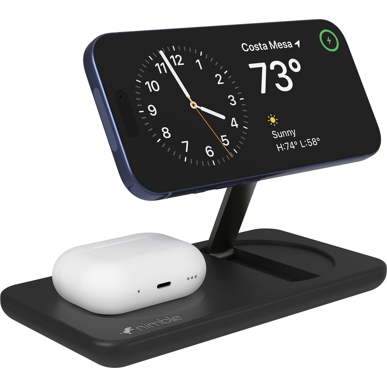 The Nimble Podium 2-in-1 Wireless Charger is built for effortless, high-speed charging and everyday convenience. . Featuring Qi2-certified technology with up to 25W wireless output, it delivers fast, reliable power while remaining fully MagSafe compatible for a secure, perfectly aligned charge. Designed to charge two devices at once, the Podium powers your smartphone and AirPods simultaneously, keeping your essentials ready without clutter. Perfect for your desk, nightstand, and everywhere in be. 0.85″ D x 6.29″ W x 3.36″ H