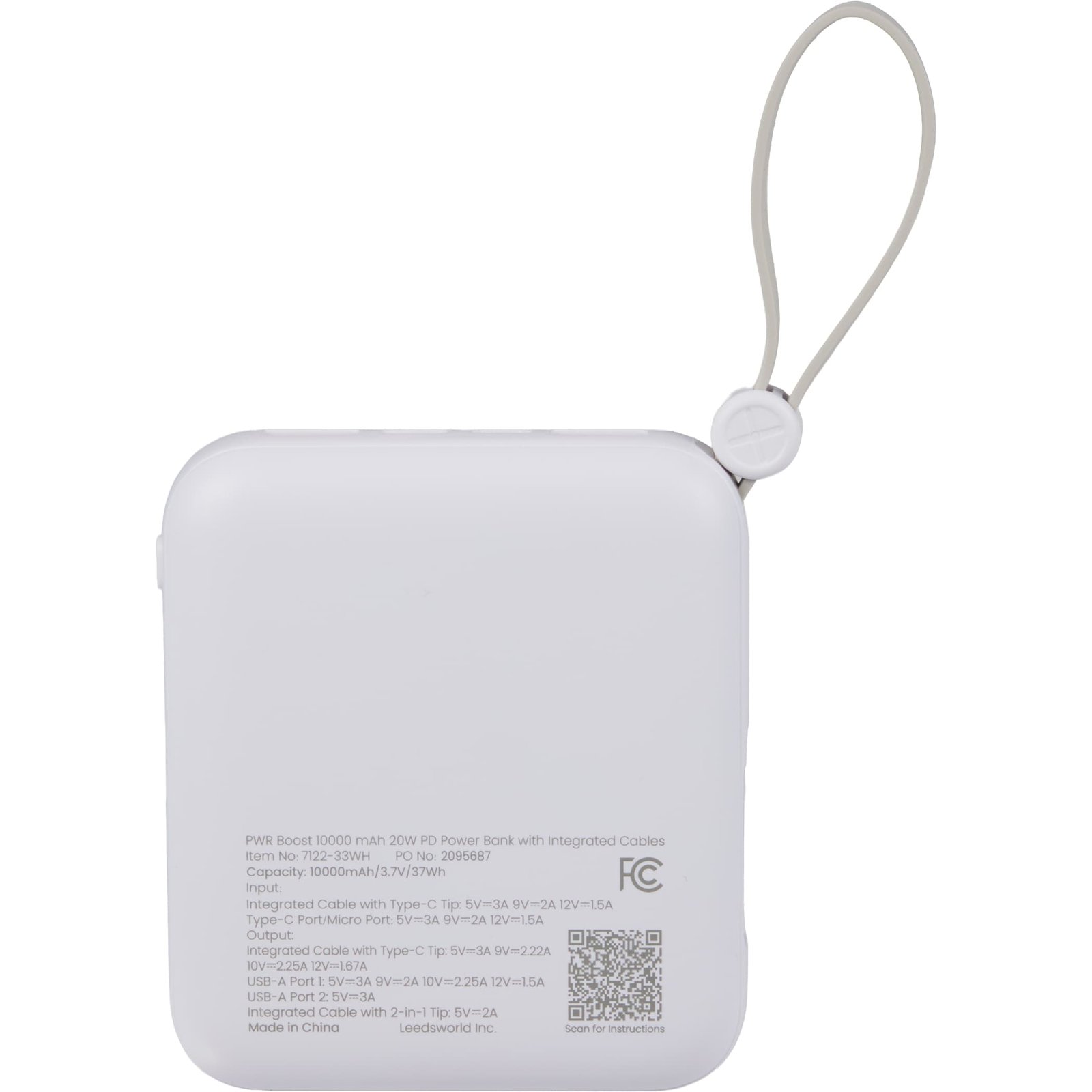 The PWR Boost 10,000 mAh 20W PD Power Bank with Cables features a digital power display, a 10,000 mAh/37Wh rechargeable lithium battery, and one Type-C Input port, one micro-USB input port, and two USB-A Output Ports. It also includes an integrated cable with Type-C tip that can be both input(5V/3A, 9V/2A, 12V/1.5A, 18W) and output(5V/3A, 9V/2.22A, 10V/2.25A, 12V/1.67A, 20W) and another integrated cable with 2-in-1 tip compatible with iPhone 14 series and below at 5V/2A/10W max charging speed. T. 3.46″ D x 3.03″ W x 0.79″ H