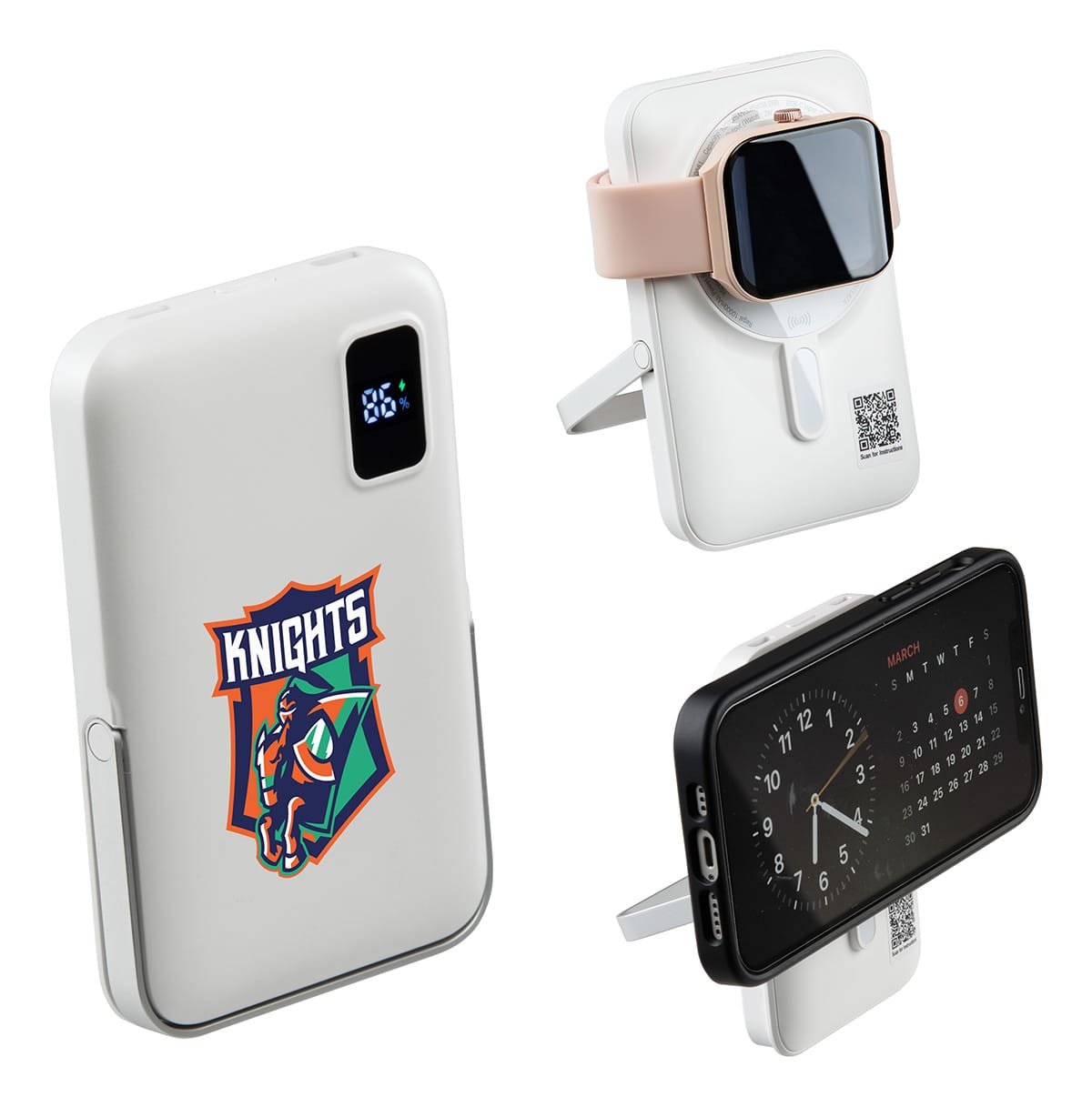 Stay powered on the go with the Regal 10000mAh 20W PD Power Bank with 15W Magnetic Wireless Charger, Watch Charger & Folding Stand, a compact power bank. Enjoy up to 15W magnetic wireless charging for your devices, including smart watch compatibility. The 20W PD USB-C input and USB output ensures fast and versatile charging. A foldable stand offers convenience while charging, and the LED display keeps you informed of power levels and charging status. Sleek, portable, and feature-packed for everyday use! Complies with FCC, Prop 65, UN38.3. 2.75″ L x 0.75″ W x 4.25″ H