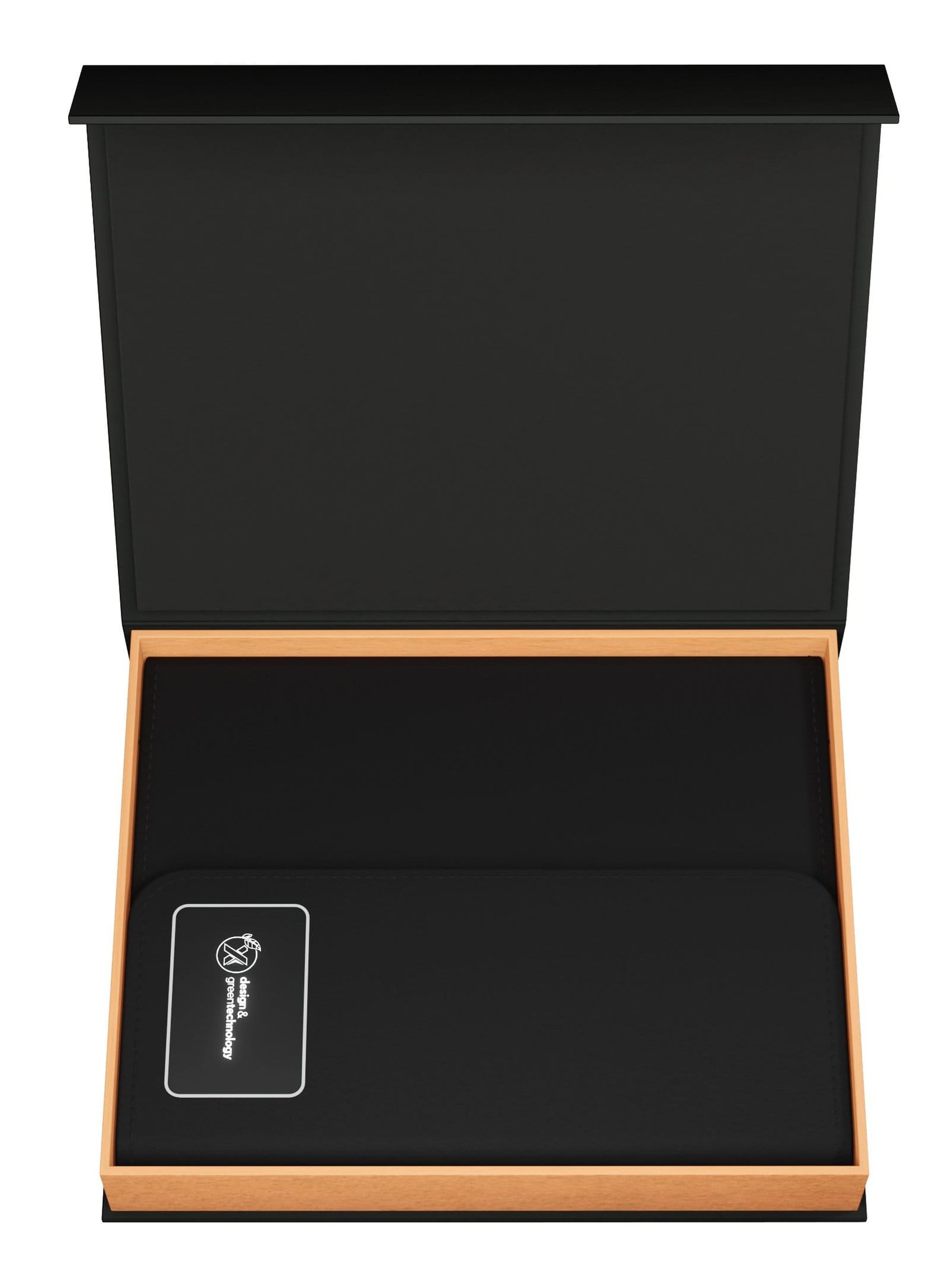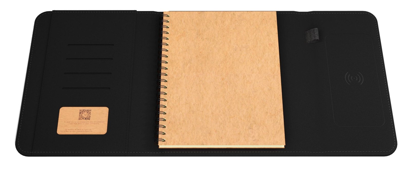 Practicality meets 21st-century technology with this multifunctional, wireless charging padfolio that features a built-in 4000 mAh power bank with a 3-in-1 integrated cable. The removable A5 recycled lined paper notebook is ideal for jotting notes, and the light-up logo brings a bit of fun to everyday office life. Includes RPET charging cable, premium gift box and 3-year warranty. Patent Pending. 7.6875″ W x 9.25″ H x 1.1875″ D