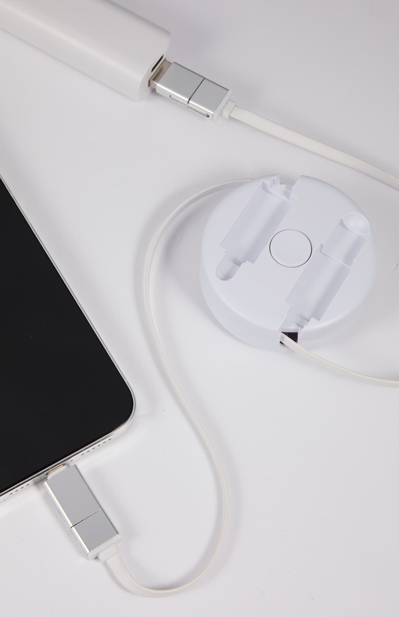 The Spinner 5-in-1 40W PD Charging Cable can be extended to 36” long and includes a USB Type-A adapter and a USB Type-C input tip on one side. The other side includes a two-in-one dual compatible adapter for both Apple iOS and Android devices (up to 9V/2A, 18W charging speed), a USB Type-C output tip. Compatible for iPhone 15 Series, Android phones with Type-C port, even iPads/tablets with Type-C port. By using Type-C to Type-C type with appropriate AC adapter, it can reach up to 20V/2A, 40W. I. 2.56″ D x 2.56″ W x 0.87″ H
