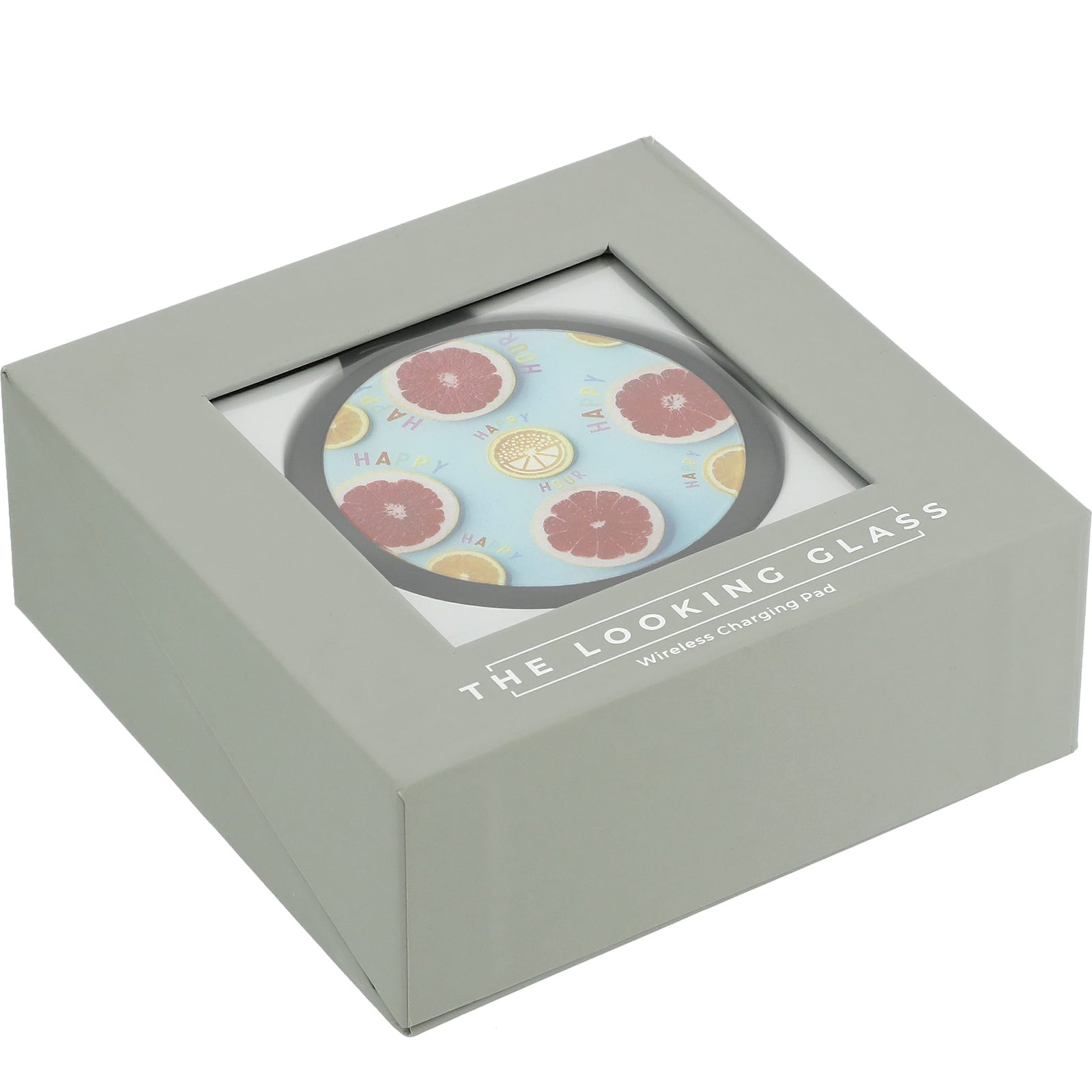The Looking Glass Wireless Charging Pad lets you charge your smartphone without the cables. The tempered glass on the surface offers a vivid, customized look. It supports 5W wireless charging for most newer devices. To charge a phone without wireless technology, an external Qi-standard wireless charging receiver or receiver case is required. Works with most plastic phone cases on. Includes a 39-inch USB-A to Type-C charging cable. Packaged in a premium gift box. 0.44″ H x 3″ W x 3″ D
