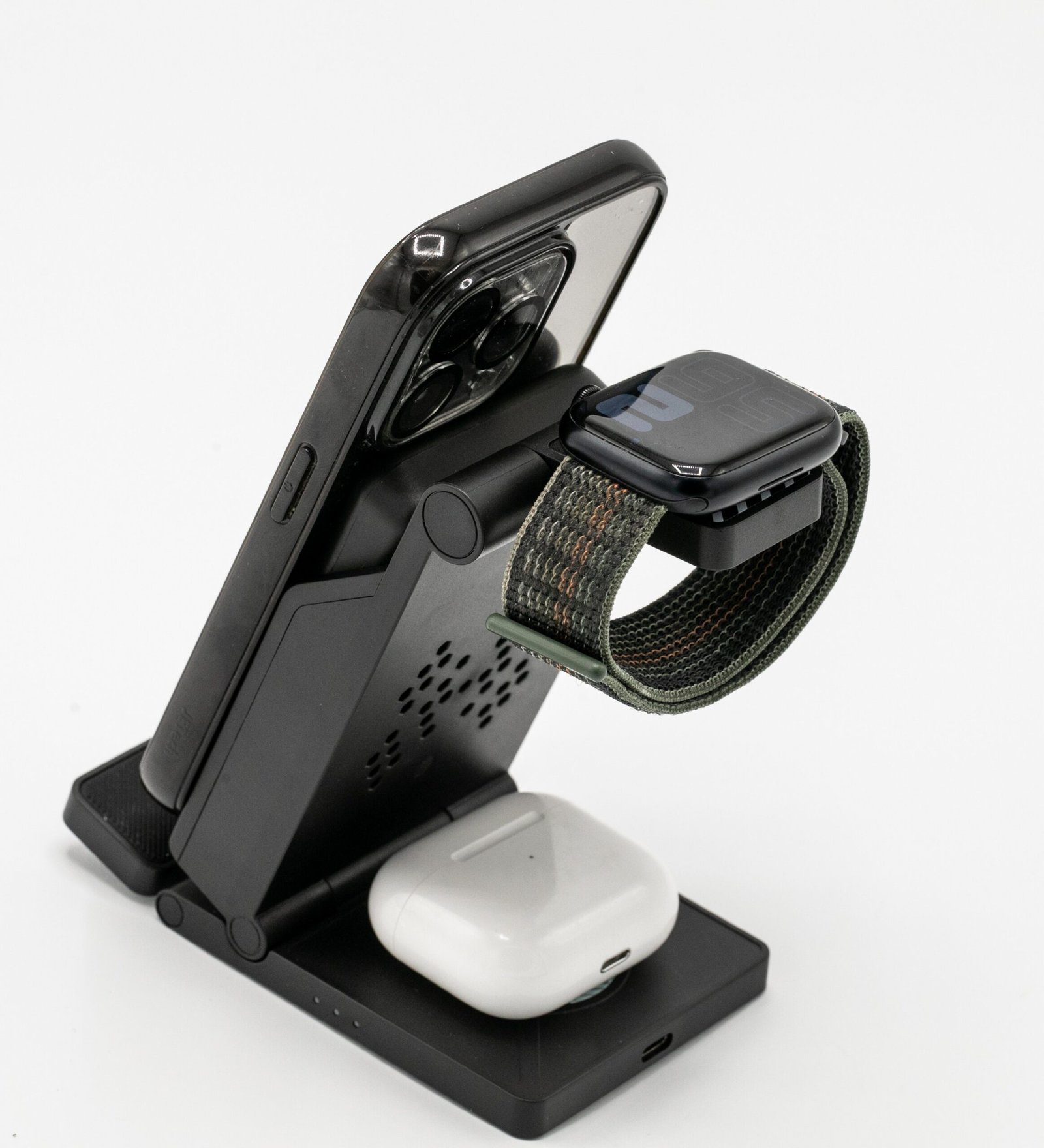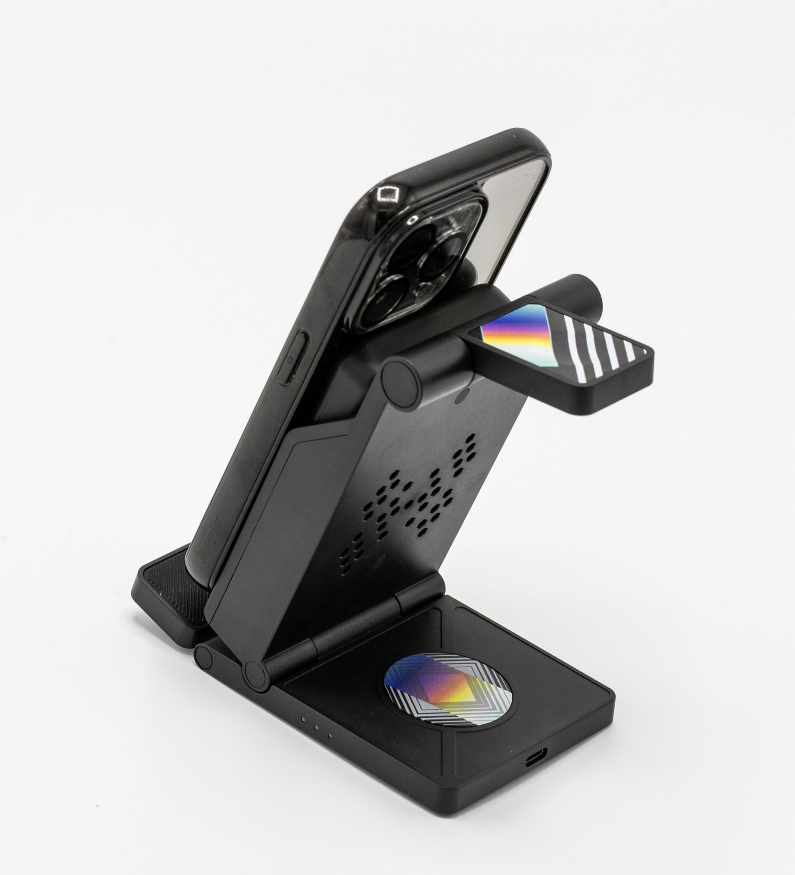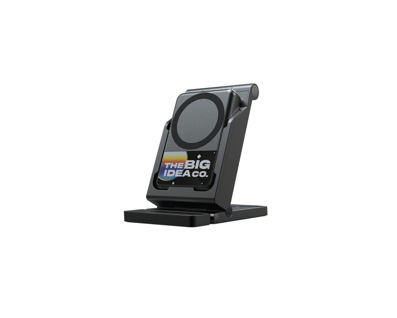 Trinifty allows you to simultaneously charge three devices at once such as your phone, your watch, and another device, all wirelessly and effortlessly. The built-in removable 5000mAh portable charger transforms this system into a portable powerhouse, so you can carry the convenience wherever you roam. Trinifty is crafted from 53% recycled materials, is carbon neutral, and can be decorated in 48hrs at a 1pc minimum. Second life packaging: Trinifty’s box transforms into a picture frame. The third imprint location is the back – 1.4”W x 1.4”H. Complies with CE, FCC, FSC, Prop 65, RoHS, UN38.3. 4.05″ L x 2.87″ W x 5.11″ H