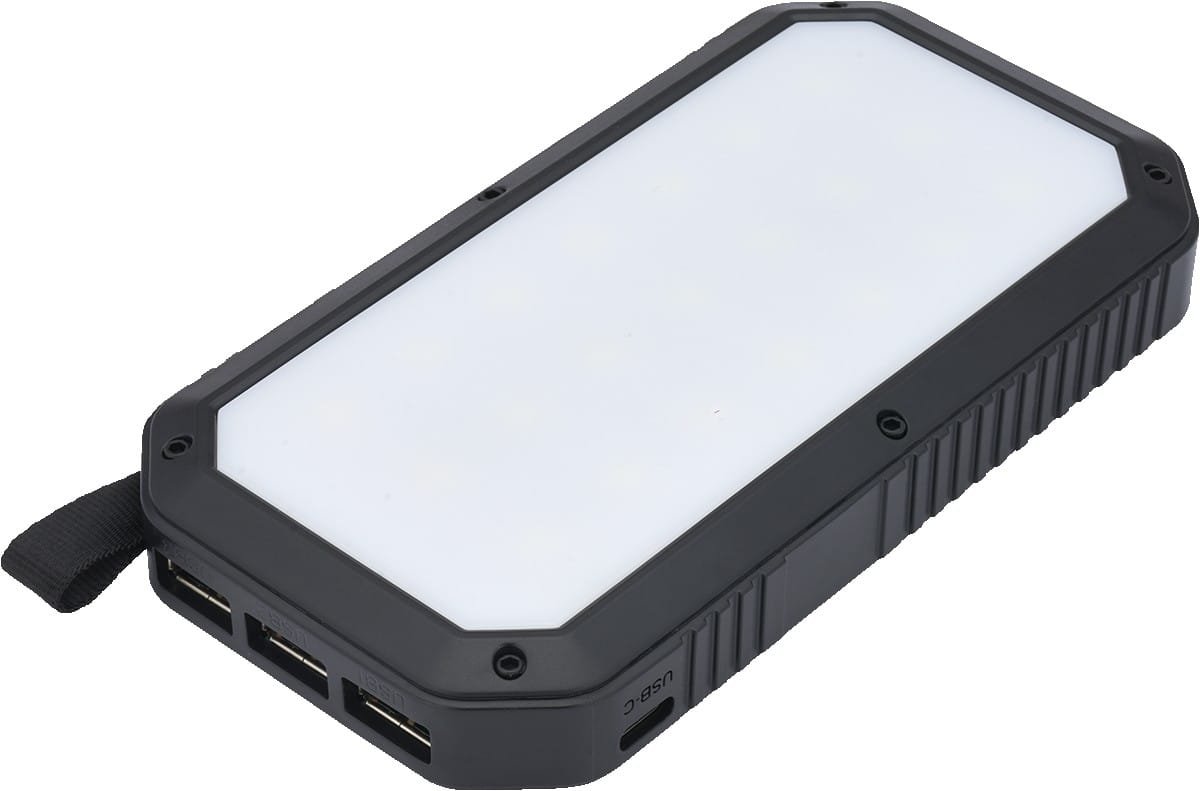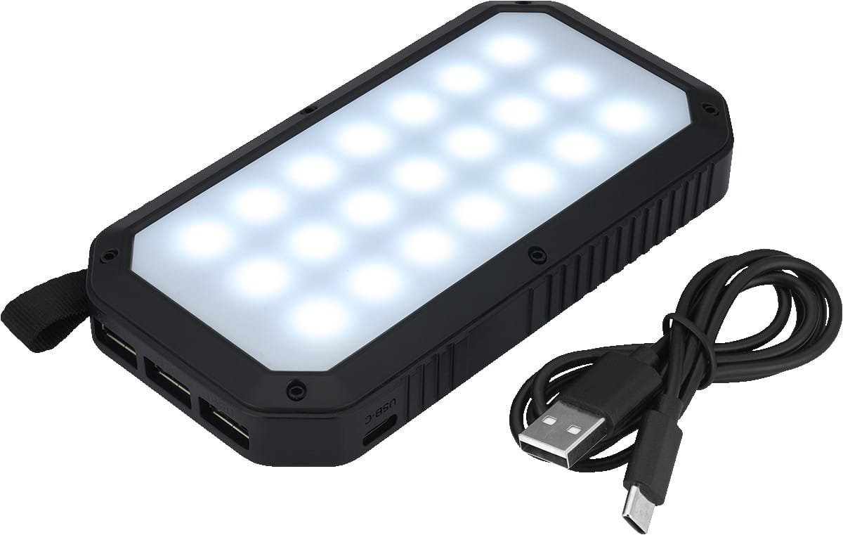 Approx 5-7 hours USB-C charging time; approx 40 hours solar panel charging time LED lights indicate battery levels and solar charging function Output 2: DC 5V/2A Features a 21 LED light panel side (approx output: 462 lumens) Power bank capacity: 8000 mAh Output 3: DC 5V/2A Constructed from ABS Plastic and a monocrystalline silicon 5V/200mA solar panel Output 1: DC 5V/1A Integrated lanyard loop Three USB ports allow multiple devices to charge simultaneously Includes USB-C charging cable and. 3″ D x 5.5″ W x 0.875″ H