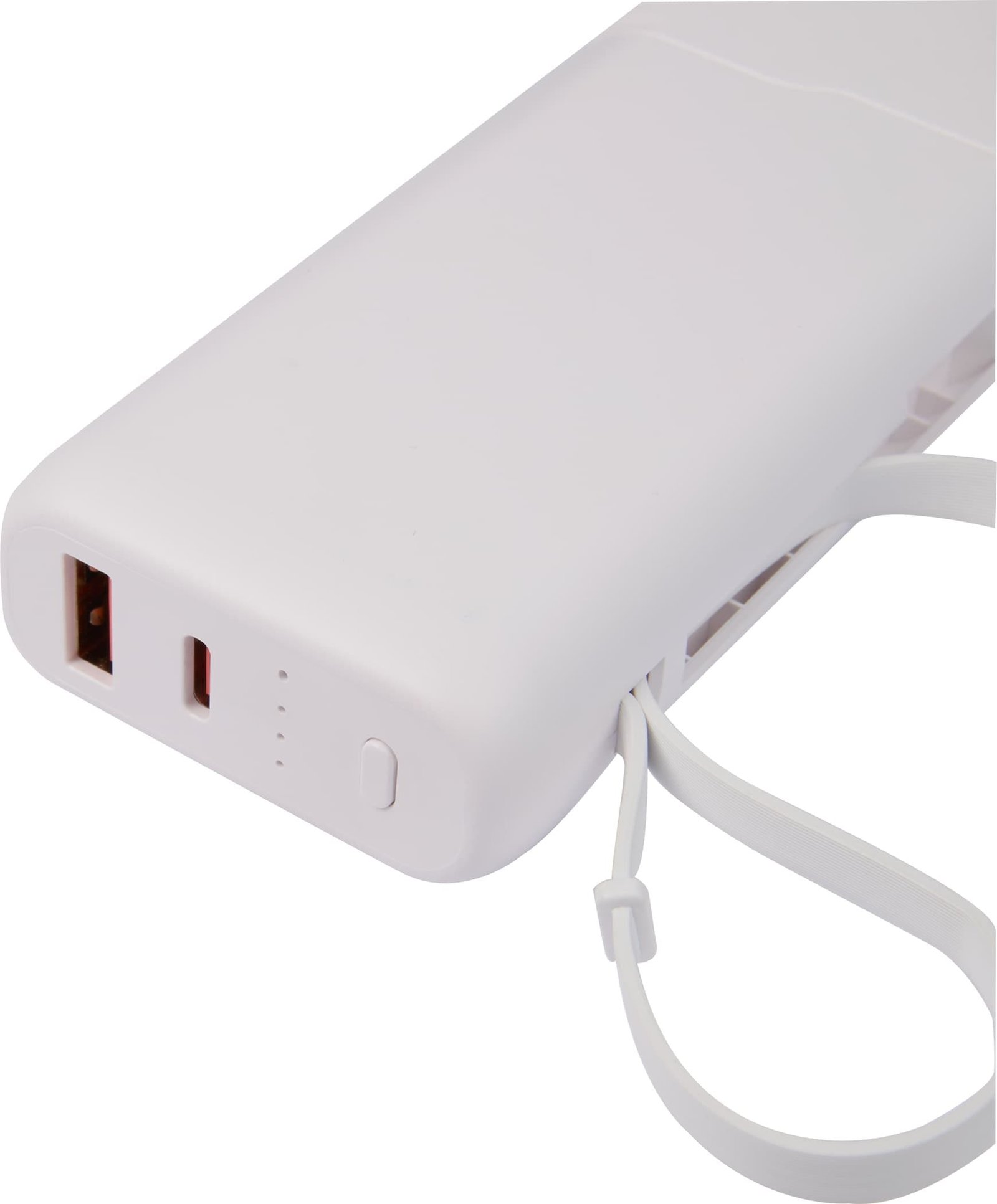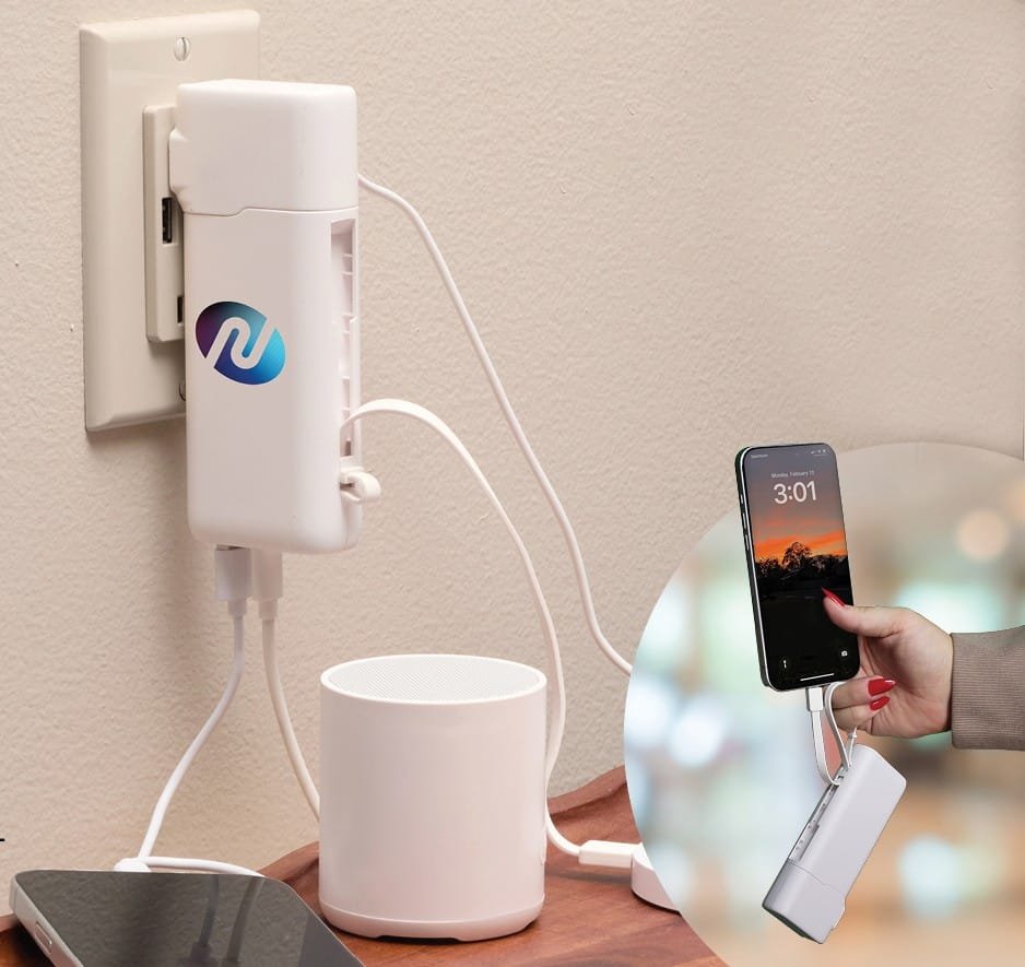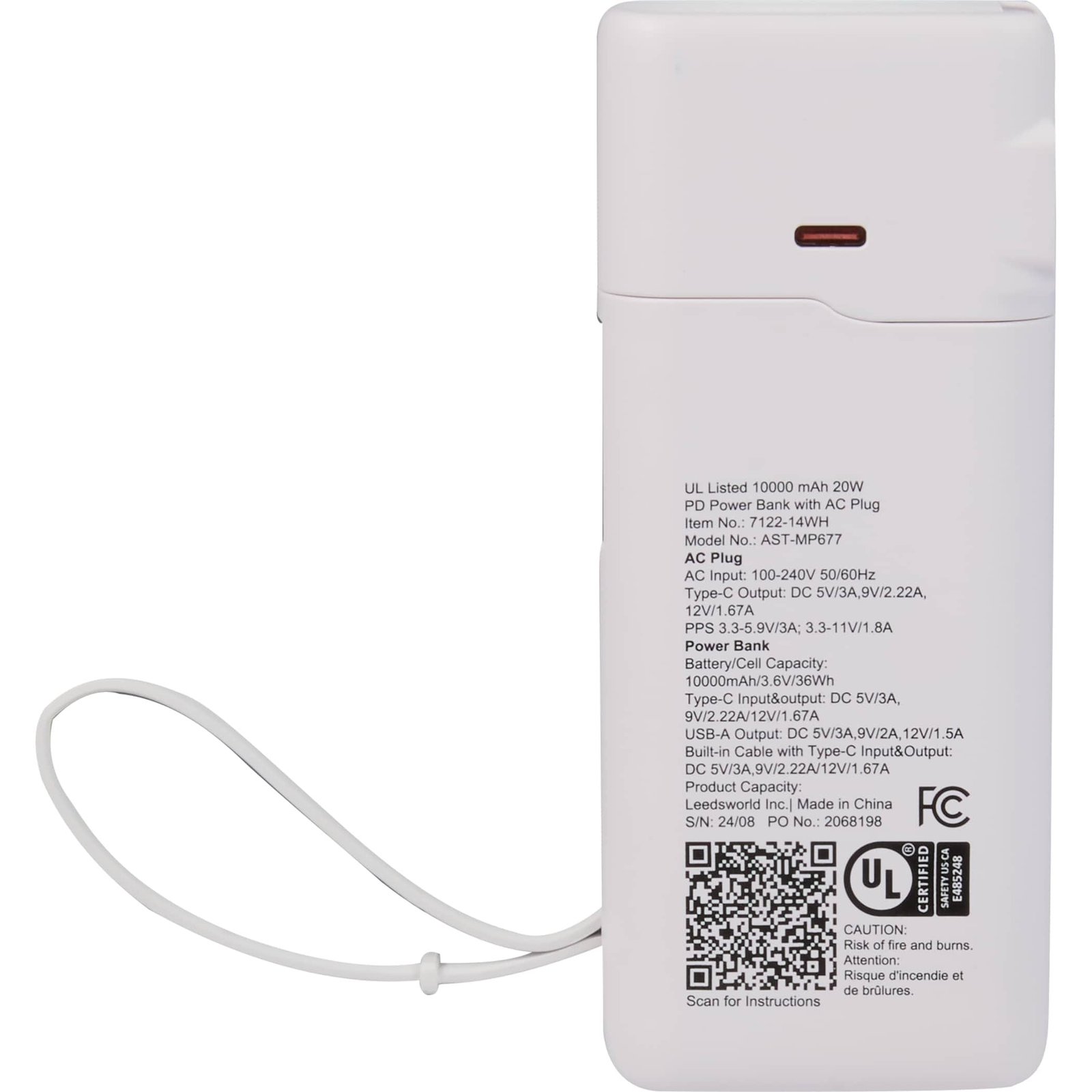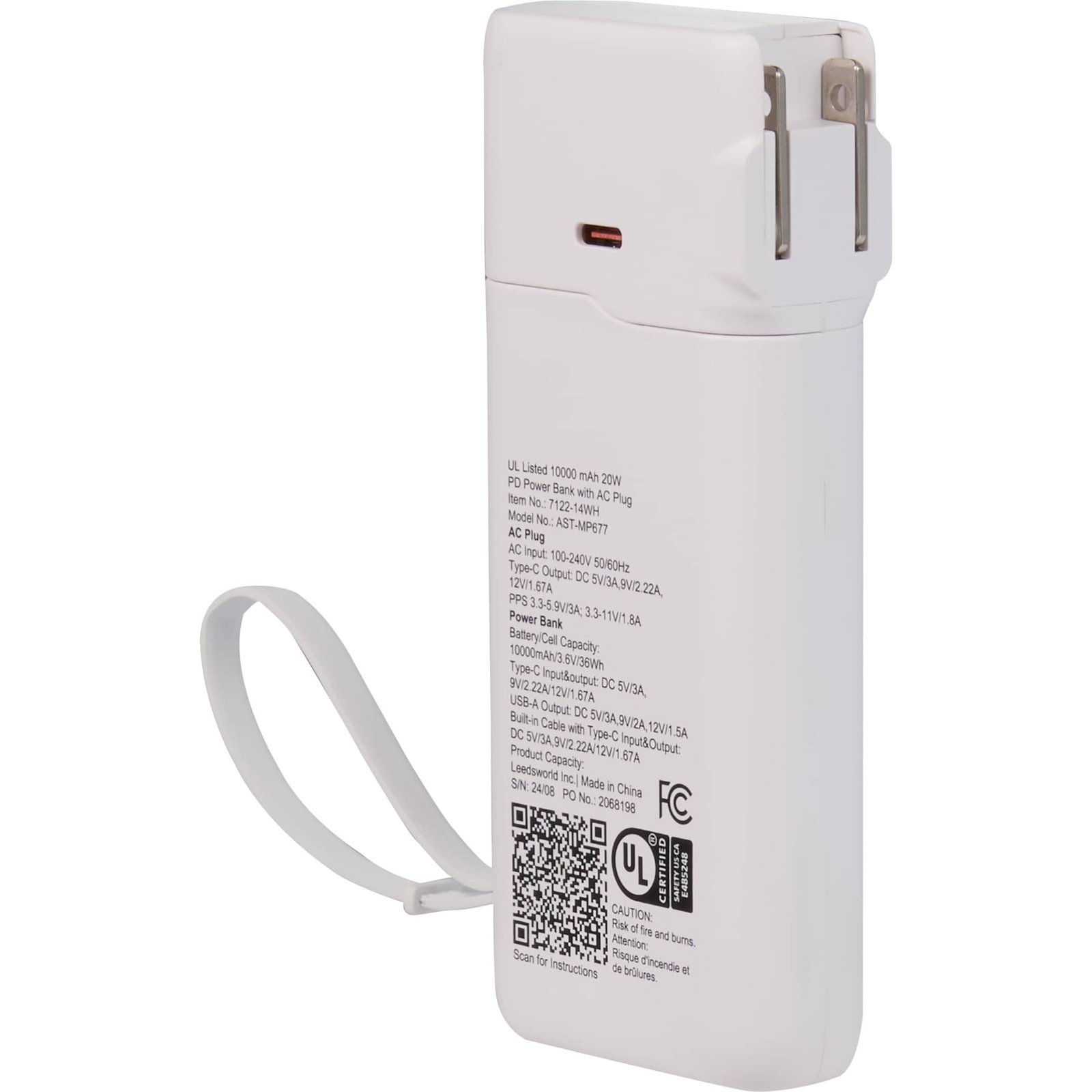 The UL Listed 10,000 mAh 20W PD Power Bank with AC Plug features a 10,000 mAh/36Wh rechargeable lithium battery with one Type-C Input/Output port of 20W and one USB-A Output Port of 18W. It also includes an integrated cable with a Type-C tip that can be both input and output at 20W charging speed and a detachable AC adapter with a Type-C output port of 20W. The power bank itself can be recharged through the attached AC adapter, or the integrated cable or your own Type-C cable. Type-C Port & Tip: 5V/3A, 9V/2.22A, 12V/1.67A (20W max); USB-A Output: 5V/3A, 9V/2A, 12V/1.5A (18W max). It supports Apple and Samsung fast charging, Qualcomm Quick Charge, and USB-C Power Delivery for high-speed charging to virtually any Type-C device. Packaged in a FSC®-certified premium gift box. UL certified. Power banks are permitted in carry-on luggage only and at the discretion of TSA agents. Please charge the power bank before initial use. 5.07″ D x 2.16″ W x 0.90″ H