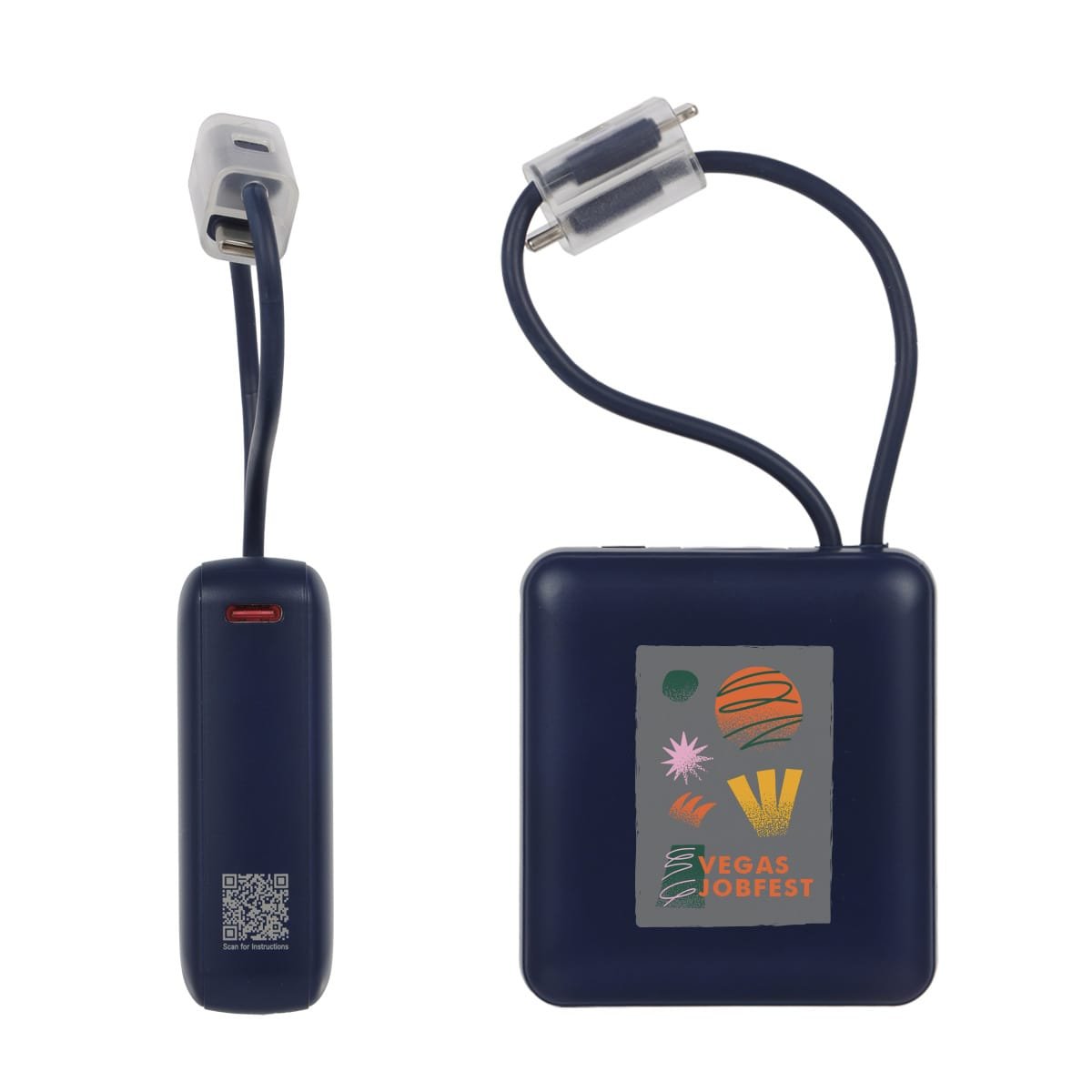 The Vanguard 10000mAh 20W PD Power Bank with Charging Cable Lanyard combines portable power with everyday convenience. It features integrated USB-C and Lightning cables that double as a carry lanyard, plus up to 20W PD fast charging for compatible devices. The compact design fits easily into bags and travel kits, making it ideal for commuting, travel, events, employee gifts, and on-the-go charging. A QR code is printed on each item providing access to the latest user manual. Complies with FCC, Prop 65, UN38.3. 2.625″ L x 0.875″ W x 2.625″ H